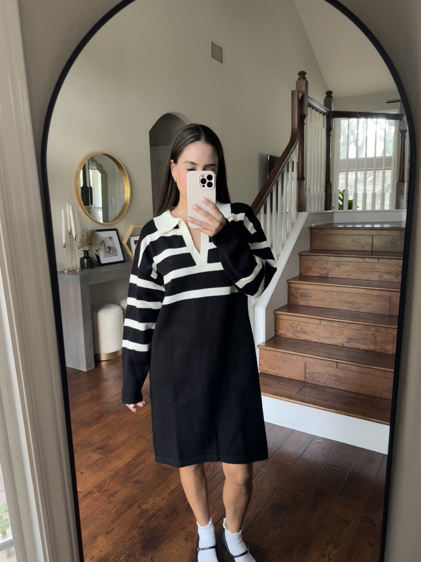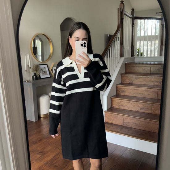 this black and white knit dress is a modern take on on a classic rugby style. with bold stripes across the top and a sleek solid all black bottom half the design draws the eye upward while subtly slimming the silhouette.
