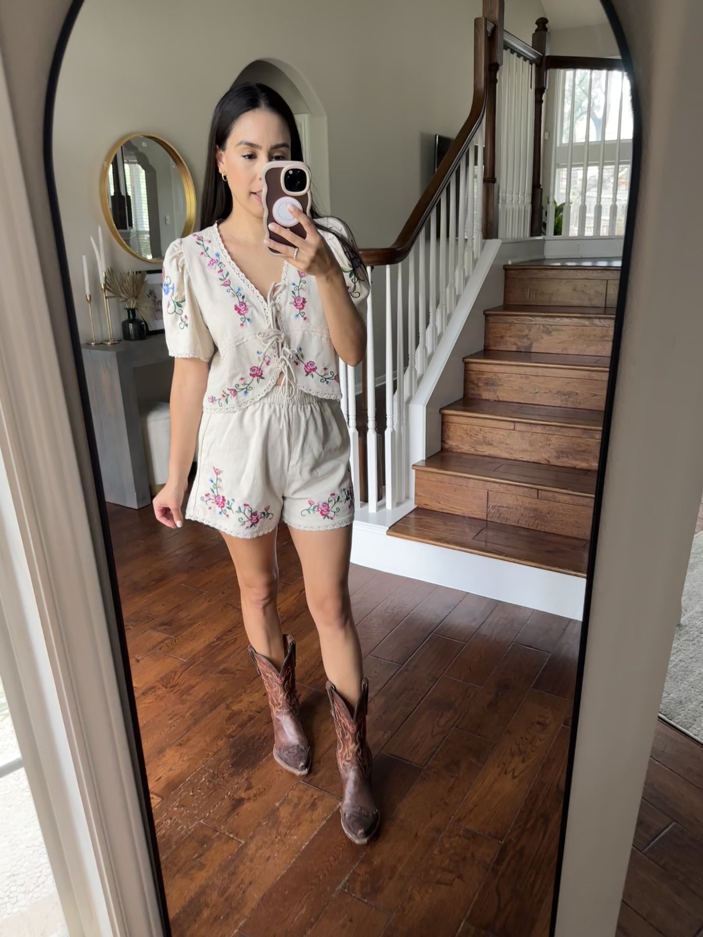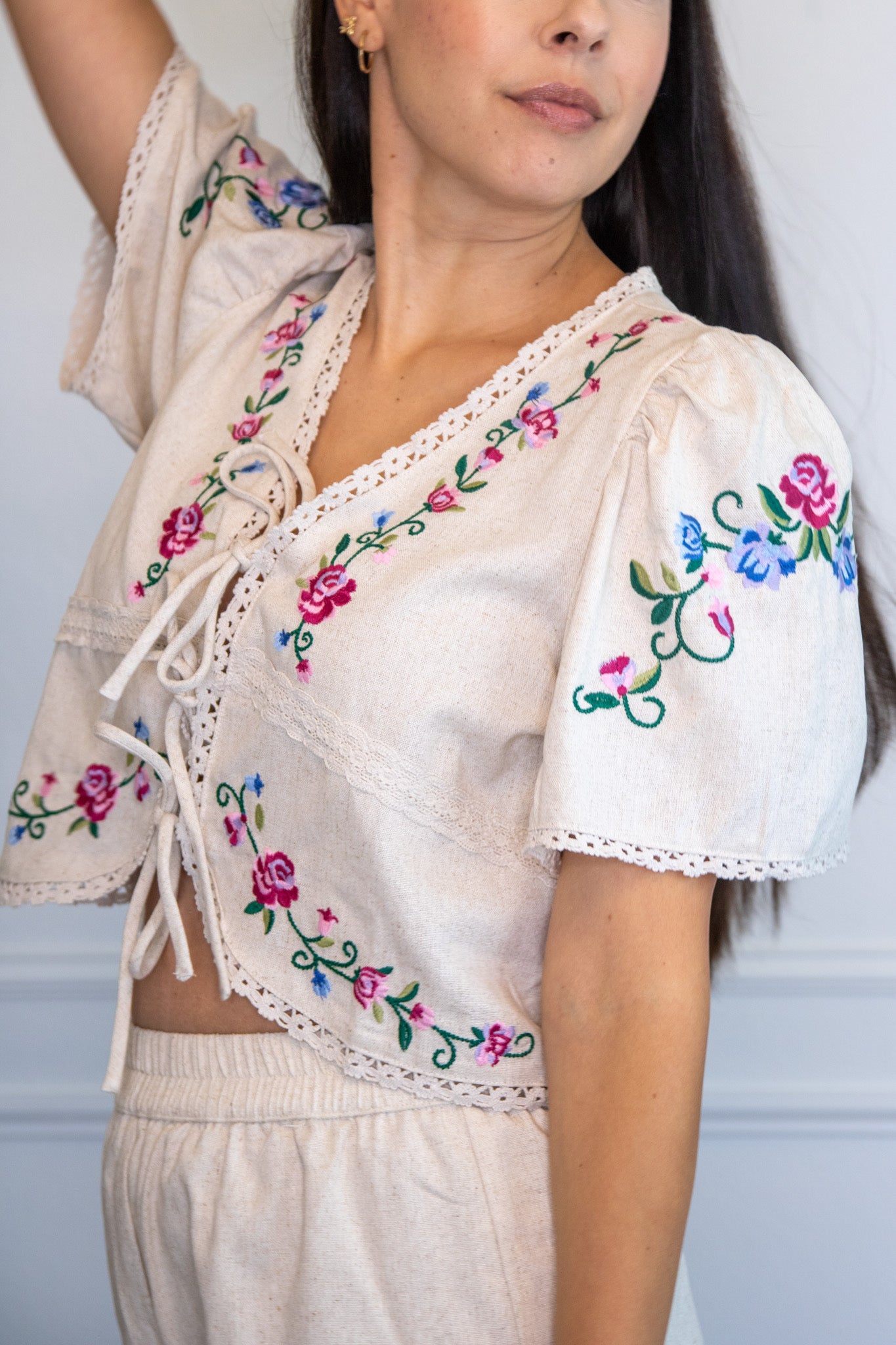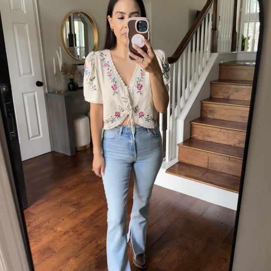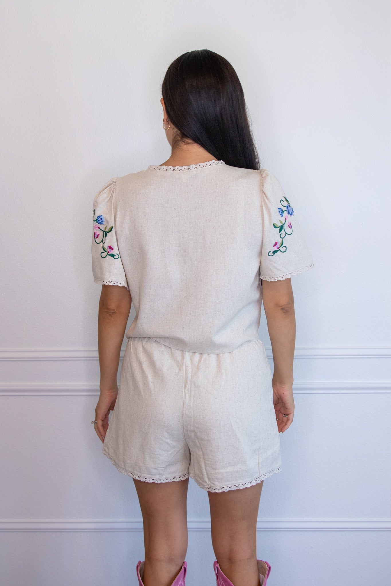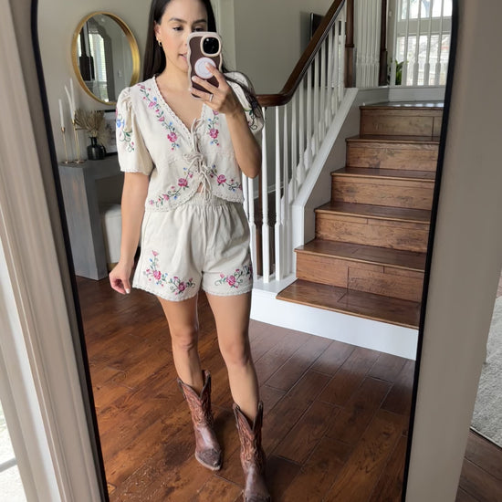 Adorned with delicate embroidered florals, this short set has a relaxed fit, it’s made for sunny days and golden hour selfies