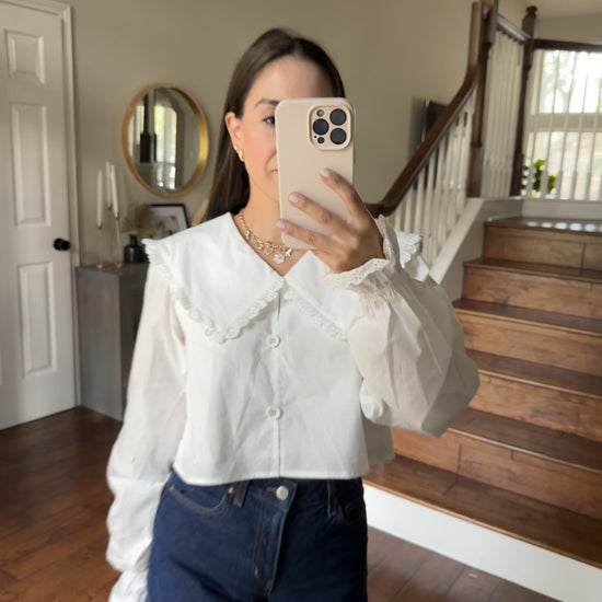 classic but make it collette. you need this frilly white button in. your closet. from summer to fall this one will be one of your most used items!