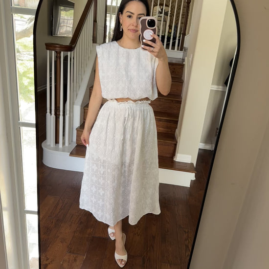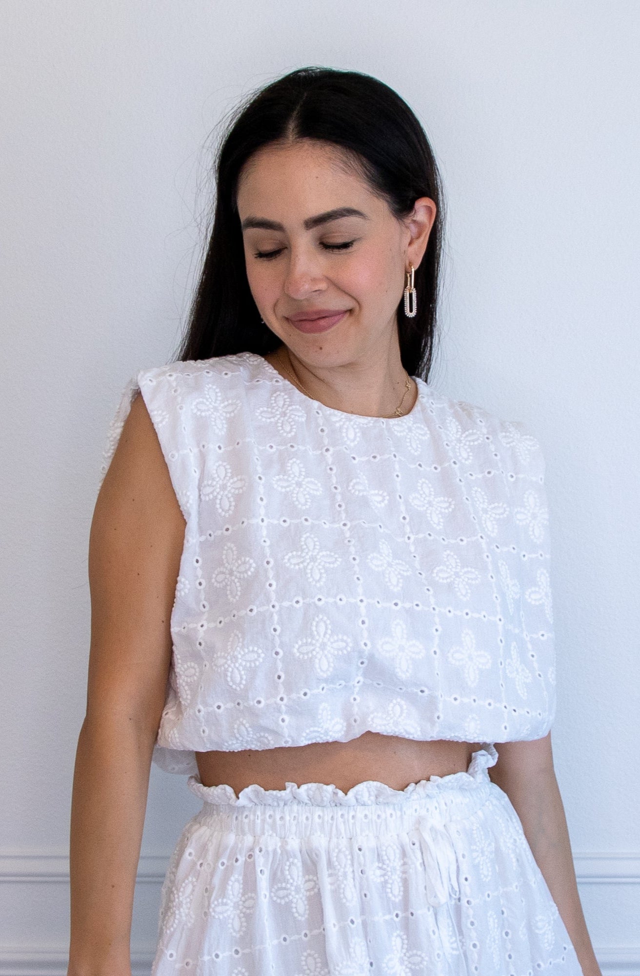 This darling top has intricate eyelet detail yet it is lightweight for those warm days! Pair it with our ENCHANTING EYELET SKIRT for a chic all white ensemble.